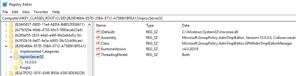 Now that we know how CLR behaves, we can find other instances by checking CLSIDs lookups in HKCU with CLR calls in the stack. One instance also in GPEdit, is the "Microsoft.GroupPolicy.AdmTmplEditor.GPMAdmTmplEditorManager" component (CLSID {B29D466A-857D-35BA-8712-A758861BFEA1} on my test VM):