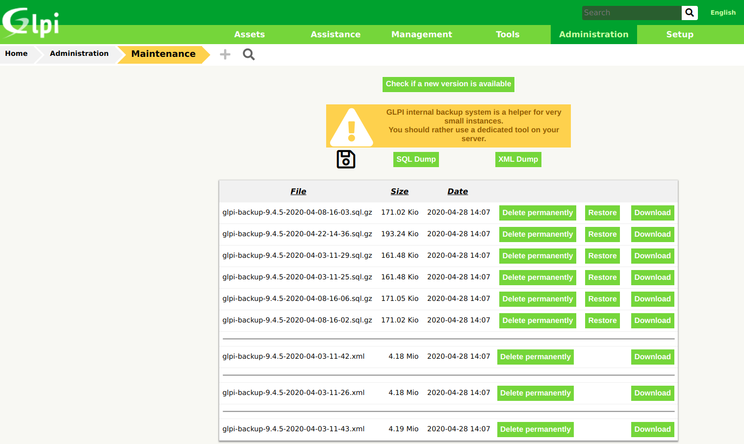 GLPI users with maintenance privileges can perform SQL/XML dumps via the dedicated menu:
